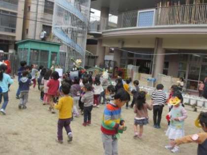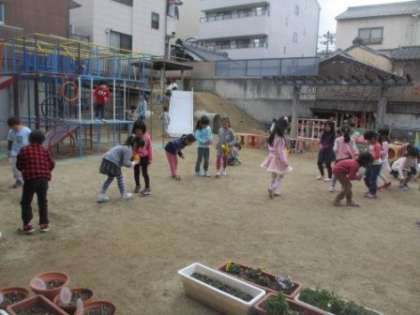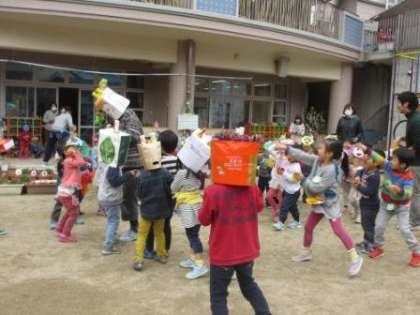 たんぽぽ組のみんな,幼稚園の友達は園庭で豆まきをしたよ。みんなはお家で豆まきをするのかな?