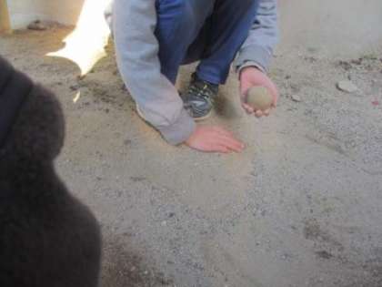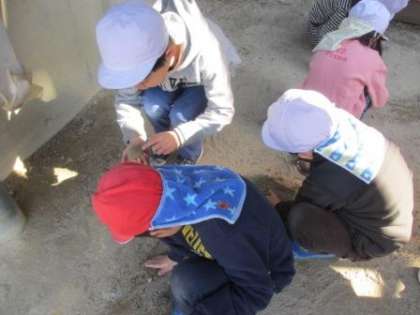 三輪車やスクーターを気持ちよさそうに,勢い良くこいでいる子ども。落ち着いた場所で泥だんごを一生懸命作っている子ども。さら粉を集めて,泥だんごを丁寧に丸めている子ども。自分で作った泥だんごを大事そうに持って,友達と見せ合いっこをしている子ども。それぞれの遊びを楽しんでいました。