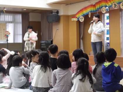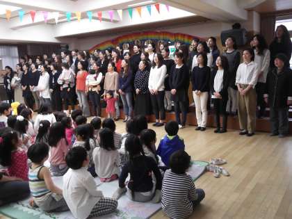 お楽しみのゲームのあとは,子どもたちの大好きな「にじ」の歌をお家の人が手話をつけて歌って聞かせてくれました。とても温かい気持ちになる歌声でした。