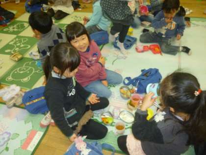4月になったら,5歳児は1年生,そして,4歳児は5歳児の部屋で過ごし始めます。もうすぐ自分たちが進級することに期待しながら,一緒に手をつないで遠足に行ったり,遊んだりした友達と隣に座り,お弁当を食べました。