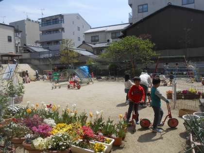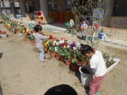 年中・年長組に新しい年少組の子どもたちも加わり幼稚園はとてもにぎやかです。きれいなお花を見つけて水を上げたり,三輪車に乗ってお出かけをしたり,いろんな大きさの石や葉っぱを見つけて友達や先生に見せたりと青空の下元気いっぱい遊びました。