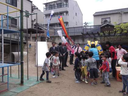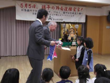 京人形青年会様より,子どもたちの健やかな成長を願うとともに,子どもたちに日本の伝統文化を大切にする心を育むという趣旨のもと,鯉のぼりを寄贈していただきました。一人に一つずつ豆鯉のぼりと小冊子も頂きました。ありがとうございました。