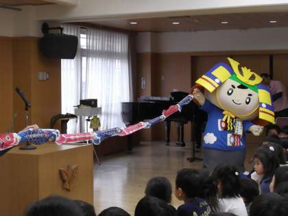 セレモニーには,端午の節句イメージキャラクターの「鎧甲太郎くん」もやってきてくれました。かわいい鎧甲太郎くんの登場に子どもたちは大喜びでした。お得意の手品を披露してくれたり,子どもたちとたくさん触れ合って遊んでくれたりし,子どもたちはたちまち鎧甲太郎くんが大好きになりました。