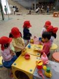 園庭に落ちている花びらをカップに集め、水を注いで混ぜると“花びらジュース”の出来上がり!「先生、飲んで!甘くておいしいよ〜」「黄色のお花はレモンの味がするよ!」「この白い砂は砂糖だよ。入れるともっと甘くなるよ!」と、テーブルの上には,色々なジュースが並べられていました。三輪車やスケーターで遊んでいた子どもたちが,「それ何?ジュース?!飲みたい!!」と言って,たくさん飲みに来てくれ,ジュース屋さんでパーティーが始まりました。砂場でご馳走をつくっていたA君がその様子に気づき「この新幹線弁当を食べて!」と言って,砂場でつくった弁当を運んできてくれました。