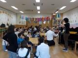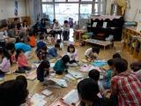 5歳児は,遊戯室で表現遊びをしました。色々な動物になったり,お家の方に風になっていただいて,こいのぼりになって泳いだりして遊びました。その後,自分たちで染めた和紙をこいのぼりにする様子を見ていただきました。