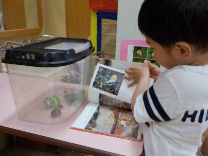 朝から登園した子どもたちはすぐに気づき虫かごを覗き込んだり,図鑑を開いて比べてみたりしながら「かたつむりさんちいさいね」「まだ寝てるのかな?」と友達や先生と話している姿が見られました。「かたつむりは何を食べるのかな?」と話をしながらかたつむりの歌を歌って新しい仲間に聞かせてあげました。