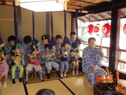 そして,親子で放下鉾のお囃子体験に行かせていただきました。先日も幼稚園で放下鉾の囃子方のみなさんに来ていただき聞かせていただきました。今日は,保存会の場所に行って,2階で聞かせていただきました。