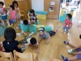 降園前,手洗いうがいに行こうとすると,ホールで年中組さんの水族館ごっこが始まっていました。「ジンベイザメのショーが始まるよ!」と声をかけてくれたのでショーを見せてもらうことにしました。そして,先生の「ジンベイザメにエサをあげよう」のことばに子どもたちは嬉しそうにエサをあげていると,年中さんのジンベイザメもジャンプをして応えてくれました。