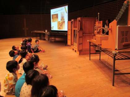 ポジティフオルガンの歴史やどのようにして音が出てくるかの仕組みを教えていただいたりしたあとは,みんなで一緒にポジティフオルガンに合わせて♪おもちゃのチャチャチャと♪勇気100%を歌ったり,カスタネットで一緒に演奏しました。