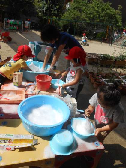 3歳児の子どもたちは,最近,泡遊びが大好きです。今日はとてもいい天気で,子どもたちはまた泡で遊ぼうと元気よく外に遊びに行きました。子どもたちは,泡の感触を「ふわふわだね。」「気持ちいいね」と言って楽しみながら,できた泡で「ソフトクリームができたよ。」「ケーキもつくったよ!おいしそう!」といろんなものに見立てて楽しんでいます。隣には,色水のジュース屋さんがあるので,ジュースの上に泡のクリームをトッピングしたりしていろんなアレンジをしている子どももいました。おいしそうなスイーツができて,うれしそうな子どもたちでした。梅雨に入りましたが,今日みたいな晴れの日が続くといいですね。