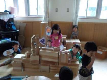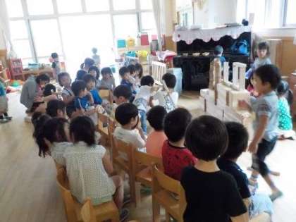 人形が出来上がると大型積み木と,小さな積み木を組み合わせて舞台を作ります。お客さんも呼んでくると,たくさん集まって来ました。子どもたちは「人形劇始まるよー!」と聞くと,パッと表情が明るくなり,「行かなきゃ!」と大急ぎでやってきました。