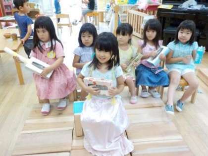 ティッシュの箱と輪ゴムをつかって,手作り楽器をつくっていました。「指ではじくといい音がするよ」ロングスカートを身につけて,コンサート会場をつくって,お客さんも招いて,演奏会が始まりました。