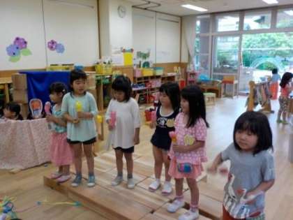 朝から雨がポツリ,ポツリ・・雨模様の一日でした。そんな梅雨のジメジメしたお天気を吹き飛ばそうと子どもたちは「雨の日コンサート」を開きました。