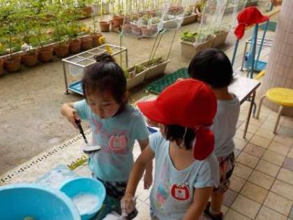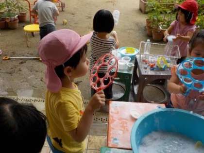 今日はあいにくの曇り空,3歳児はプール遊びの代わりにシャボン玉で遊ぶことにしました。輪っかにシャボン玉液を付け,そっと息を吹きかけると,シャボン玉ができました。「わ〜大きいのができた!」と喜んだり,「あれ,できないな〜」と何度も試してみたりしていました。でも最後はシャボン玉液を手で混ぜて,泡遊びが始まりました。泡や液の感触を楽しんでいるようでした。