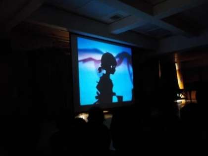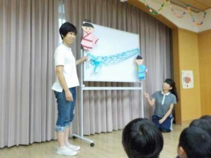 子どもたちはとても真剣に見入っていました。輝く石が空に昇って星になったというお話を聞いて,「石がお星様になったんだって!」と幻想的なお話のイメージを楽しんでいました。