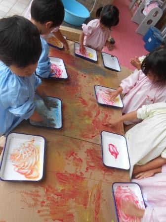もも組は立てかけたダンボールやクラフト紙に,ちゅうりっぷ組は机にタイベックスという丈夫な紙を敷きそこにペタペタのり絵具をつけて遊んでいきました。