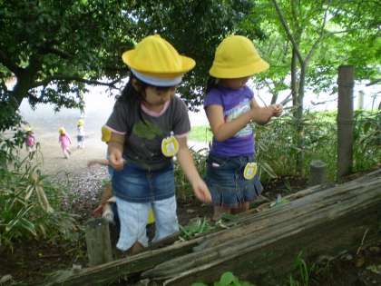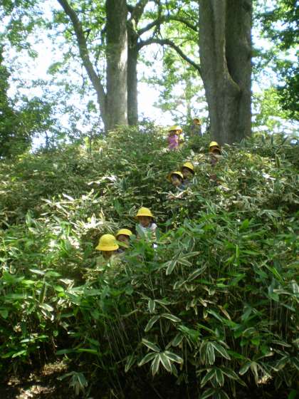 出水口付近にある笹山に到着。ここは熊笹が生い茂っていて小高くなっています。道がたくさんあって,あちこちへ探検に出かけられます。「冒険に出発だ!先生も行こうよ!」「ここを家にしよう。ご飯も作ろう。」思い思いの遊びを子どもたちは楽しんでいました。