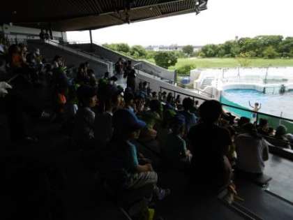 おおきいぐみらんど第一日目のお楽しみは,水族館への遠足。みんなでバスにのり,京都水族館へ出かけました。たくさんの魚や水の中の生き物たちに興味津々。イルカショーでは,ストロー笛をふきながらイルカとセッションしたり,応援したり楽しみました。