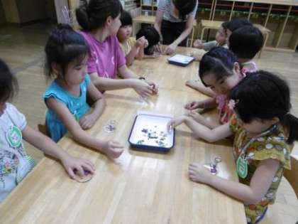 スペシャルな2日間の思い出に,最後にお土産づくりもしました。4歳児のときから大事に育てていた花を4月に押し花にしたものをキーホルダーにして世界にひとつだけの,おおきいくみらんどのキーホルダーができました。