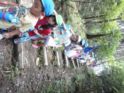 水遊びの用意をして,いざ出発です!水遊びをする親水広場までは,子どもの足で30分ほど。暑い暑い中,山道をえっちらおっちら歩いて行きました。でもこの暑い中歩くから,気持ちいんですよね。途中,小川が流れていたり,トンボがいたりします。いろんな発見を楽しんでいきます。