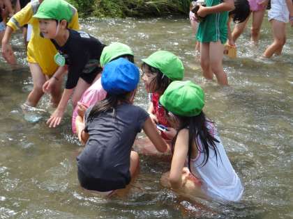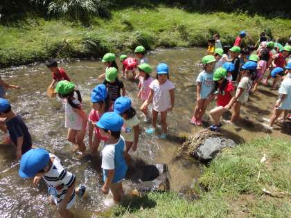 水はとっても冷たいのですが,気温が暑いせいかちょうど程よく気持ちよかったです。川の流れを感じたり,石をめくって沢ガニを探したり,いろんな形の石を集めて石屋さんをしている子もいました。他の園の持っていた,水中を見る道具を借りている子もいました。