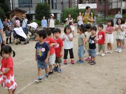 夏のつどいのスタートは,竹間公園で園長先生やPTA会長さんの挨拶を聞いた後,「中京もえぎ音頭」を全員で大きな輪になって踊りました。