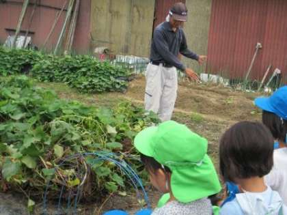 そして,畑の先生が今の土の中にあるサツマイモを少しだけ掘って見せてくれました。かわいい小さい赤ちゃんお芋を見て子どもたちは大喜び。「かわいいお芋やな」「次きたときはもっと大きくなってるかな」と話していました。