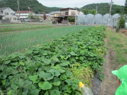 植えた時には小さかった苗が,ツルが伸び,葉っぱも子どもたちの手より大きくなっているのを見て「ツルがながくなってるなあ」「お芋大きくなってるかなあ」と嬉しそうに様子を見ながらお世話をしました。