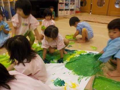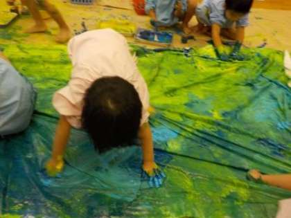 3歳児の子どもたちは,絵具遊びをしました。真っ白で大きな紙を広げると子どもたちは,「うわぁー,大きい」と言って喜んでいました。絵具が用意されると,手につけて紙の上で絵具を広げていました。手や足,全身を使って感触を楽しみながら,絵具を塗り広げていきます。白い紙に色がつく様子が楽しかったようで,「ここ,まだ白いで」「ここは色んな色ついてるね」と話していました。自然と色同士が混ざり,「緑じゃなくなった」などと絵具が混ざった時の色の変化も楽しんでいました。