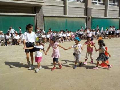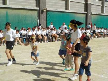 4歳児が京都御池中学校の御池フェスティバル体育の部に参加しました。「学校行くの初めてだから嬉しい」「お姉ちゃんいるかな?」自分の兄弟や顔見知りのお兄さん,お姉さんに会えるのを楽しみしていた子どもたち。