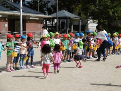 ゆり組・すみれ組の子どもたちはゴールで待ち構えていて,優しくお土産を手渡してくれていました。お土産は黄色いバケツ。早速に遊び始めた子どもたちもいましたね!