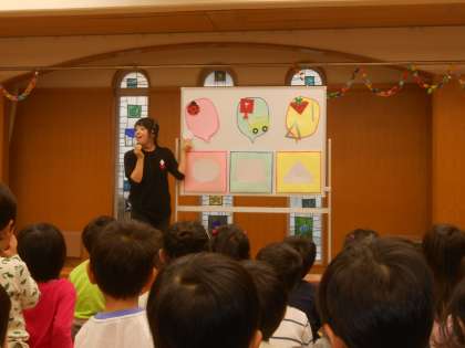 お楽しみでは,なぞなぞをみんなで楽しみました。なぞなぞ虫が三角の袋にやってきて,なぞなぞを出します。「においを嗅いでみると,あまいにおいがするよ」「頭には帽子をかぶっているよ」とヒントを聞いて「いちご!」と子どもたちは自信満々に答えます。他にも,四角や丸の袋からもたくさんのなぞなぞが出てきました。子どもたちは,いろんな形から聞こえた声をよく聞いて,考えて答えていました。