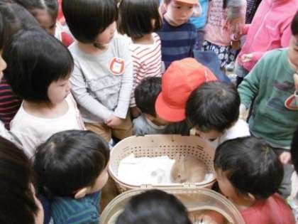 子どもたちは少し緊張している様で,「はやく見たいな」「驚かせないようにしなきゃ」そんな気持ちが伝わってきました。「かわいいー」「ちっちゃいね」「しろいうさぎさんと,茶色のうさぎさんだ」「触ってもいいの?」と,子どもたちは,とても嬉しそうに,そして優しい表情で目の前にいる小さなうさぎの赤ちゃんを見ていました。