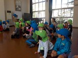 お見送りをした後,3歳児の子どもからは「あの耳付けたい」と言う声がたくさん聞こえてきました。そこで,5歳児の子どもたちのマネをしてクラスカラー帽に耳を付け,うさぎになりきって遊びました。遊びながら「なぁうさぎさんまだ?」「はやく見たいー」と5歳児の子どもたちの帰りを首を長くして待っていました。