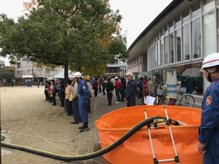 まずは公園で,各町内からの避難状況の確認をされた後,災害用マンホールトイレの設置訓練や土嚢のつくり方,組み方等の訓練をされた後,園内に場所を移動しての訓練になりました。