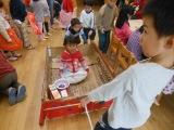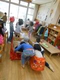 トナカイになっている年長さんが「乗ってもいいよ」と声をかけてくれました。「乗りたい!乗りたい!」とたくさんの子どもたちが乗ったので,引っ張ろうとしても,重くて動きません。「重い!一人ずつにしてください。」と年長のトナカイさん。そして一人ずつ乗せてもらうことにしました。本当のソリに乗った気分だったのかな,とっても楽しそうでした。そして最後は年長さんにソリに乗ってもらい,年少児のサンタさんトナカイさんになってソリを引っ張っていました。