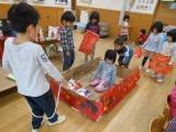 プレゼントをつくり,ソリにのせて,サンタクロースやトナカイになって遊んでいるちゅうりっぷ組ともも組の子どもたちです。