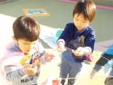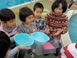 朝のマラソンが終わると3階のプールの様子を見に行く子どもたち。「先生,大変!プールのお水が凍ってる!」「おばけが来たんや!」「氷のおばけが来たんや!!」と大興奮です。早速,3階の鍵を開けてプールサイドに行ってみると「すごい!」「カチコチになってる!」と,そうっと触ってみようとする姿が見られました。先生が氷を割ってタライの中に入れると,「うわっ,冷たい」「キラキラしてるね」と言ったり,自分の顔の大きさと氷の大きさを比べたりしていました。たくさんの氷のかけらをタライに入れて部屋に持って帰ると,「氷のご馳走をつくりたい」と言って,園庭に持っていき“氷のケーキ”や“氷のスープ”をつくって遊ぶ姿が見られました。