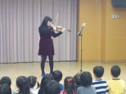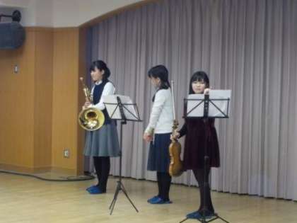 子どもたちはホルンの奏でる「ふるさと」にうっとりしながら耳を傾けたり,フルートの「ハイホー」に心踊ったり,子どもたちの知っているバイオリンで情熱大陸のテーマソングの演奏が始まると,「知ってる」「聞いたことがある」と自然に手拍子が起こり,遊戯室が盛り上がりムードになりました。みんなで「幸せなら手をたたこう」を大合唱して,幸せな気分のまま余韻を残し,コンサートは終わりました