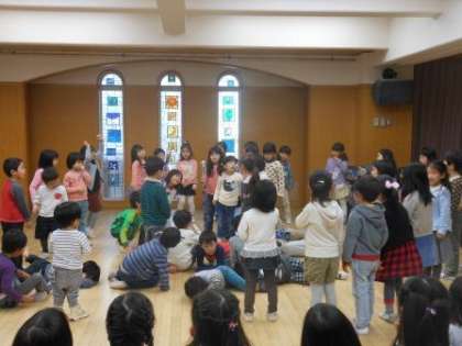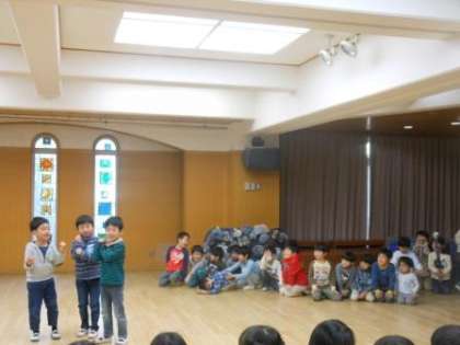 今日はゆり組の劇遊び「おしいれのだいぼうけん」をゆり組,すみれ組みんなの子どもで遊ぶことになりました。ゆり組が遊んでいる様子をよく見ていたすみれ組は,なりたい役を決め,ゆり組の子どもたちに教えてもらいながら,動きをやってみたり,セリフを言ってみたり・・・押入を冒険しました。そんな劇遊びを見ていたたんぽぽ組,ひまわり組の子どもたち。「自分たちもやってみたい」という気持ちをもち,ひまわり組の「ぽんたのじどうはんばいき」をひまわり組,たんぽぽ組のみんなでしてみることになりました。ぽんたに「友達が欲しい」と願った子どもたちの思いが叶い,たくさんの仲間で劇遊びを楽しむことができました。
