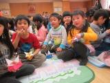 3歳児は午前中にちゅうりっぷ組の保育室に集まって絵本をみたり,歌を歌ったりして楽しみました。5歳児のお兄さんお姉さんからもらったつのこうばこに入れてあられもおいしくいただきました。