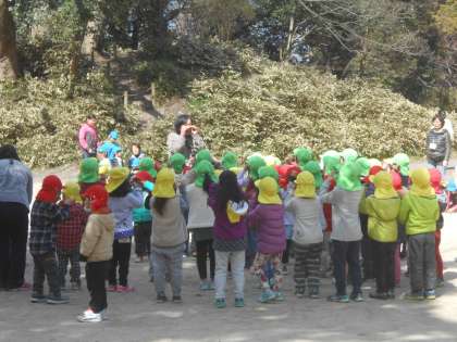 「園外保育に行った時に地震や火事が起きたらどうしたらいいかな」と子どもたちに尋ねると,「先生の所にいく」「地震の時は頭を押さえる」「火事の時は口を押える」等々。一年間,避難訓練を行ってきたことがちゃんと子どもたちの身についているなと感じました。「地震です」という合図で子どもたちは全員,その場に座って頭を押さえていました。いつどこで災害は起こるかわかりません。園外でも避難訓練をすることができていい経験になったと思いました。