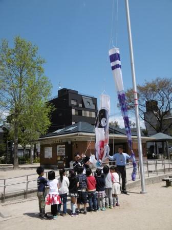 こどもみらい館の職員の方のお話の後,子どもたちを代表して,こどもの日を迎える5月の誕生児の子どもたちがポールの前に集まり,保育室でも歌っているこいのぼりの歌に合わせて,縄を引きながら公園のポールにこいのぼりがのぼっていく様子をみていました。