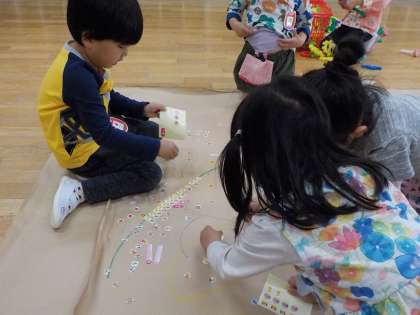クレパスで描かれた一本の線を見つけてそこに線を書き足して線路をつくり,その上に動物のシールを貼って電車に乗せてあげたり,丸で書いた中にちょうちょやチューリップのシールを歌いながら貼ったりしている姿が見られました。貼るのもかくのも楽しくてすぐにシールがなくなるくらいみんなで楽しみました。