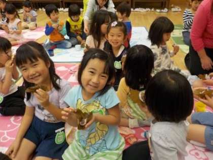 絵本を見たり歌を歌ったりしたあと,柏餅をいただきました。3歳児の子どもたちは初めて幼稚園でクラスで集って食べました。「おいしい!」「もっと食べたい」と,にこにこの子どもたちです。