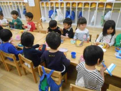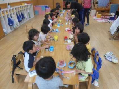 今日は,3歳児は初めてのお弁当の日でした。朝登園してくると,幼稚園でお弁当を食べることをとても楽しみにしていた子どもたちは,「今日お弁当持ってきたよ!」「お弁当早く食べたい!」とワクワクした様子でした。お弁当を食べることに気持ちを高まらせながら遊んでいました。片づけが終わると,「お弁当やー!」「おなかすいた!」と目をキラキラさせて,お弁当を食べる準備をしました。みんなで食べるお弁当はとてもおいしかったようで,隣同士になったお友だちと「おいしいね!」と話しながら食べたり,お弁当を見せ合ったりと初めてのお弁当を楽しみました。