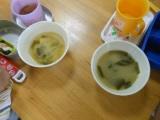 今日のお味噌汁には,幼稚園産のたまねぎ,ねぎ,わかめ,油揚げを入れることにしました。たまねぎを切り始めると「目が痛くなった」「涙が出る」と言っていた子どもたちですが,キッチンルームからだんだんいい匂いがしてくると,「もうできた?」「そろそろごはんにしよか」と食べたい気持ちがいっぱいです。野菜は苦手だったという子どもも幼稚園で収穫したたまねぎの味噌汁は特別な味がして,おいしくいただけたようです。
