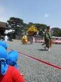大きな牛車や馬をみて,「馬や〜」「牛さん大きい車を引っ張ってる」と歓声をあげたり,斎王代の登場には「お姫様,きれい」と嬉しそうに見つめたりしていました。