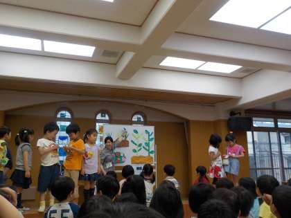 5歳児は、先日収穫しお味噌汁にして食べたたまねぎ、4歳児は、塩ゆでして食べた豆、3歳児は日に日に赤くなっていくのを楽しみに収穫しているいちご、それぞれに鳥、ちょうちょ、はちがやってきて誕生児の紹介をしてもらいました。