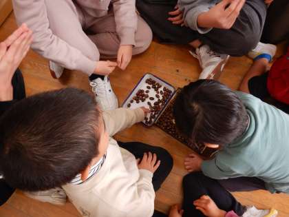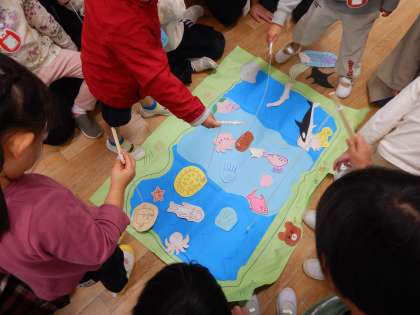 洛風中学校の3年生が、保育体験実習でちゅうりっぷ組に来てくれました。魚釣りと、箱の中身当ての遊びを手づくりして持ってきてくれました。子どもたちは大喜び!中学生とやりとりしながら、用意してくれた遊びを楽しみました。他にも、御苑で見つけた自慢のピカピカどんぐりを見てもらったり、好きな絵本を読んでもらったりと、楽しい時間を過ごしました。
